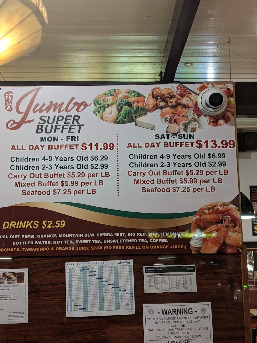 The menu at Jumbo Super Buffet offers a variety of Asian and Chinese cuisine served in a buffet format. Visitors can expect a diverse selection of dishes typical of buffet dining, including options suitable for lunch and dinner. The menu includes a range of hot dishes, likely featuring traditional Chinese and other Asian specialties, as well as vegetarian options.